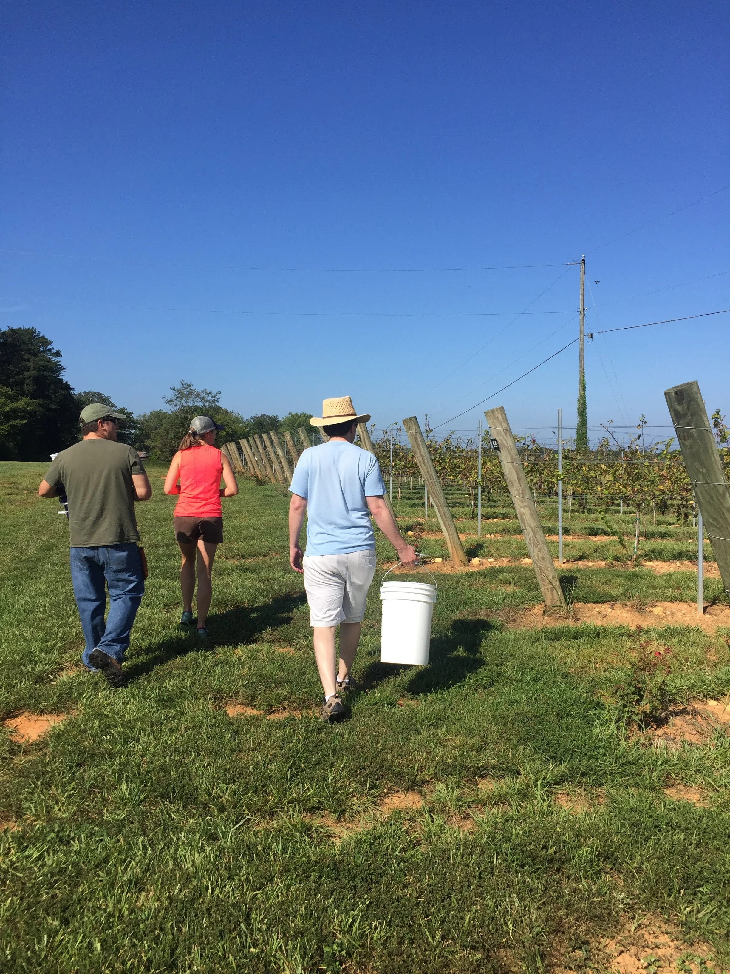 Well, harvest season is upon us, and this weekend we got the opportunity to pick Chardonnay and Pinot Gris grapes from Haze Gray Vineyards. They have about 8 acres of grapes planted on an old tobacco farm in Dobson. The vineyard has been established for several years, and they plan to open the tasting room next year, so stay tuned! In the meantime, you can stay in a beautiful cottage right in the heart of the vineyard.